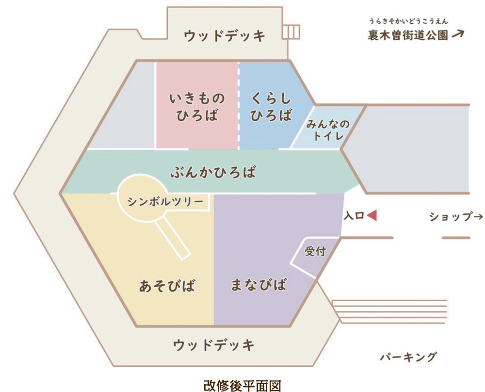 改修にあたり、森林文化アカデミーの学生さんが教員サポートの元、基本構想を計画しました。木曽五木にちなみ、「木とかかわる暮らし・遊び・学び・文化・いきもの」をテーマにした5ゾーン分けや「森への入口」というコンセプトが提案され、そのまま設計に活かされています。