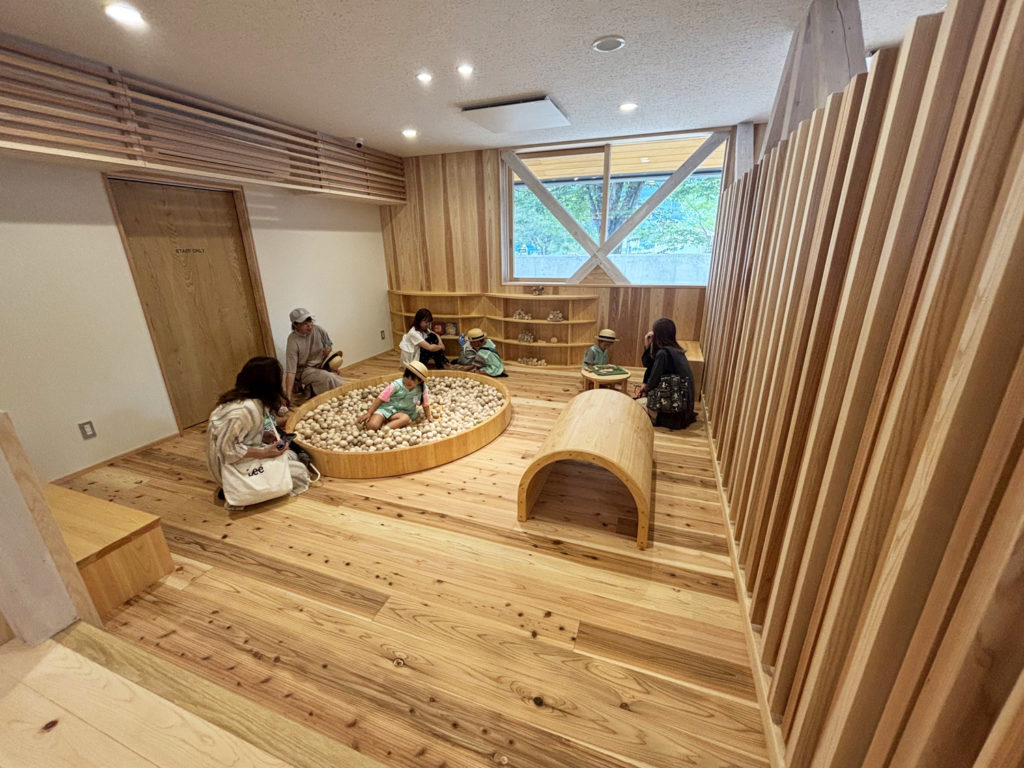 無事竣工を迎えた森の木遊館は、付知の文化が育まれた森への入口として、来場者を出迎えています。外部・内部には県内の地域材がふんだんに使われ、室内には切株をイメージしたサワラとヒノキのシンボルツリーを配置し滑り台を設置しました。ガラス越しに周辺の山並み感じながら、赤ちゃん連れの親子や地域の子供たちに木の素材やたくさんの木のおもちゃに触れて遊んでいただいています。