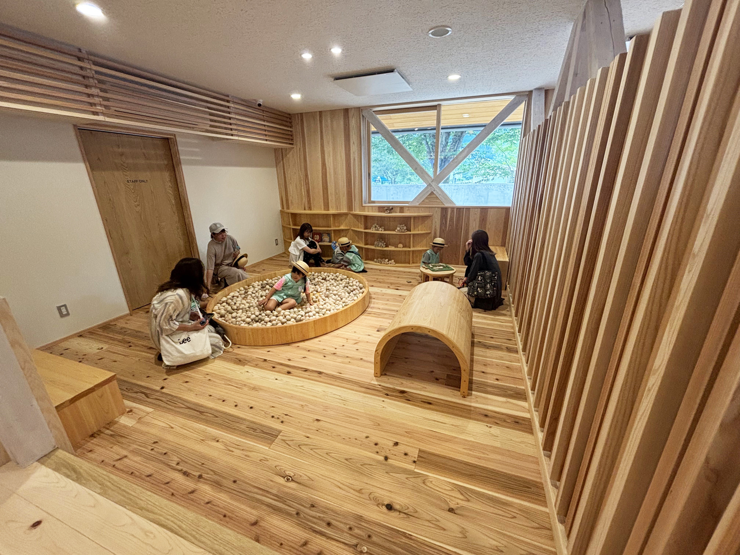 木曽五木を並べたシンボルツリーの階段、この地域の桶の技術を活かした木桶のトンネル、ぎふ木遊館から寄贈された樹齢約400年のスギのベンチや木の玉ボール、随所に栗材や枝付のヒノキ柱が配置され、さらに木のおもちゃやオブジェが加わり楽しい空間を演出しています。点在する135角のベイマツの筋交は色を白く塗り存在感を減らしつつ、室内を緩やかにゾーン分けしています。