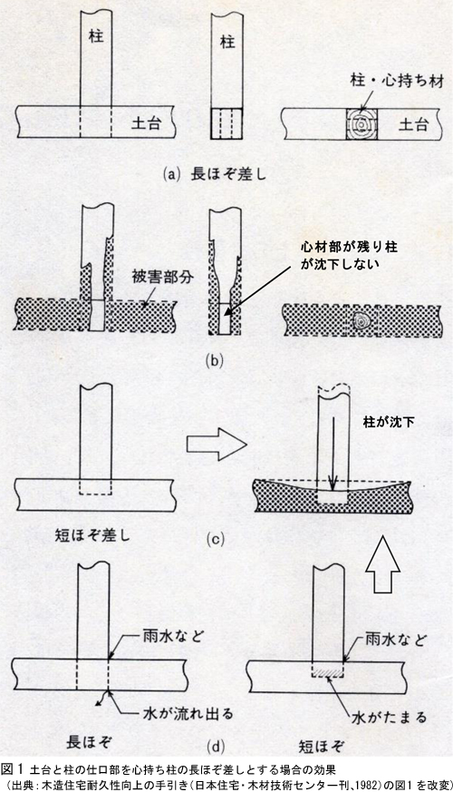 ■木造建築で傷みやすい箇所の一例としては、現在の建築基準法でも防腐・防蟻の措置が求められる地盤面に近い土台、軸組下部、下地板などがあります。土台にはヒノキ、ヒバ、クリなどの腐りにくい樹種の心材を使い、柱にはヒノキを中心とした樹種の心材ないしは心材部分を多く含む心持ち材が使われました。さらに柱と土台の仕口は図1に示すように打ち抜きほぞ(長ほぞ)として仕口部分から雨水が抜けるようにするとともに、心持ち材の柱とすることで柱の下端部の辺材部が腐っても心材部が柱の沈下を防ぐという工夫をしています。下地板も雨が掛かりやすくまた地面からの跳ね返り水が作用して乾燥しにくい地盤面近くの部分には赤味の板を使い、辺材(白太)を多く含む板は雨が掛かりにくい壁の上部に使うなどしたものです。