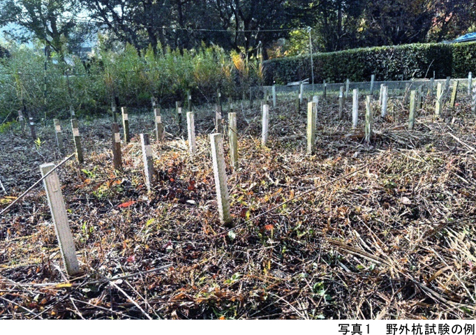 ◇ このような大工技能の一要素としての心材と辺材の耐久性の違いに関する知見は、様々な実験によっても古くから科学的に明らかにされています。基本的データとしては国や大学などの研究機関が長期にわたる野外杭試験(写真1)などにより各種樹種の耐久性評価を行っていますが、写真2は筆者がかつて実験した結果の一部です。実大のヒノキ心持ち土台材を促進劣化槽(劣化が早まるように腐朽菌の活性度を高めた土壌槽)に2年間埋めた結果です。これを見ても分かるように、中心の心材部分は健全であるのに対して周辺の辺材部分は一部が腐って断面が欠損しています。この結果からも、土台はヒノキといえども耐久性があるのは心材部分であり、辺材は腐りやすいということが分かるかと思います。