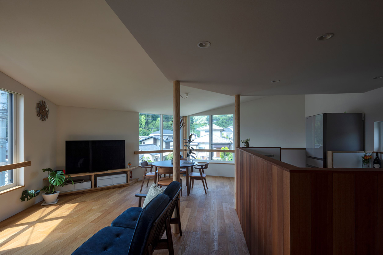 □この春には新協建設工業㈱ 施工で高気密高断熱の新築住宅を竣工しました。住まい手はリビングにサッシを L型 に配置し、それを活かした設計を望まれていたので、2階 LDKには 3方向(内 2面は L型)を大きく開く高断熱樹脂サッシとした上でハニカムスクリーンを設置しました。他はコストバランスを考慮し、目安として ” HEAT 20 ” の指針を基に G2グレード をクリアする設計としております。L型 のサッシの中央に吉野杉の丸柱を配置するなど意匠にこだわった分、気密性能を確保するのが難しい部分もありましたが、性能を確実なものとするために施工者には尽力していただき、同じ住宅医として、今後のメンテナンスも見据えた設計と施工を行えました。