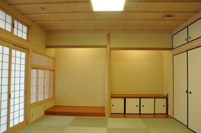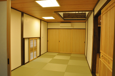 ■庫裏Aの改修工事は2014年7月から2016年7月、本堂と同じく屋根瓦の吹き替えを10年前にしたが、瓦を一旦下ろして野地板防水補修と小屋組み補強、梁から基礎までの耐震補強を行い、断熱改修もしっかりしたため、全館調湿熱交換換気ユニットで特に夏の湿気対策に効果を発揮、冬もさほど暖房を使用せずとも暖かいと大変好評です。