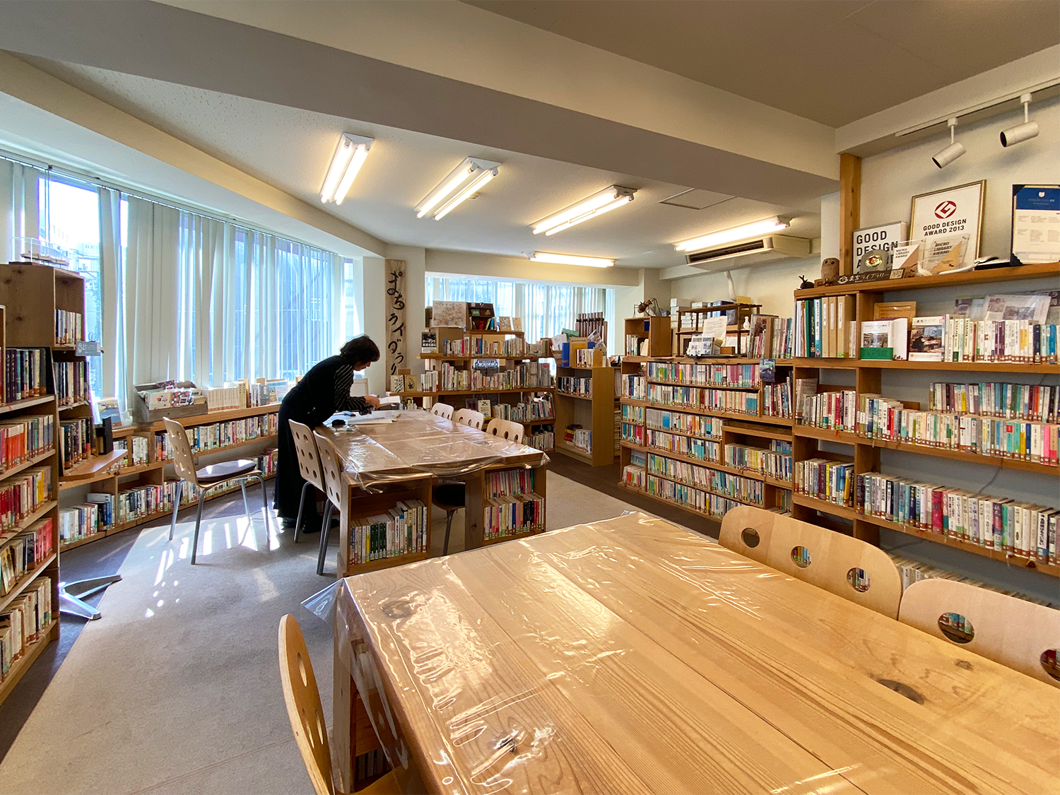 事務所のビル3階にあるまちライブラリー。吉野杉を使った本棚や机はボランティアによる手作りとのこと。