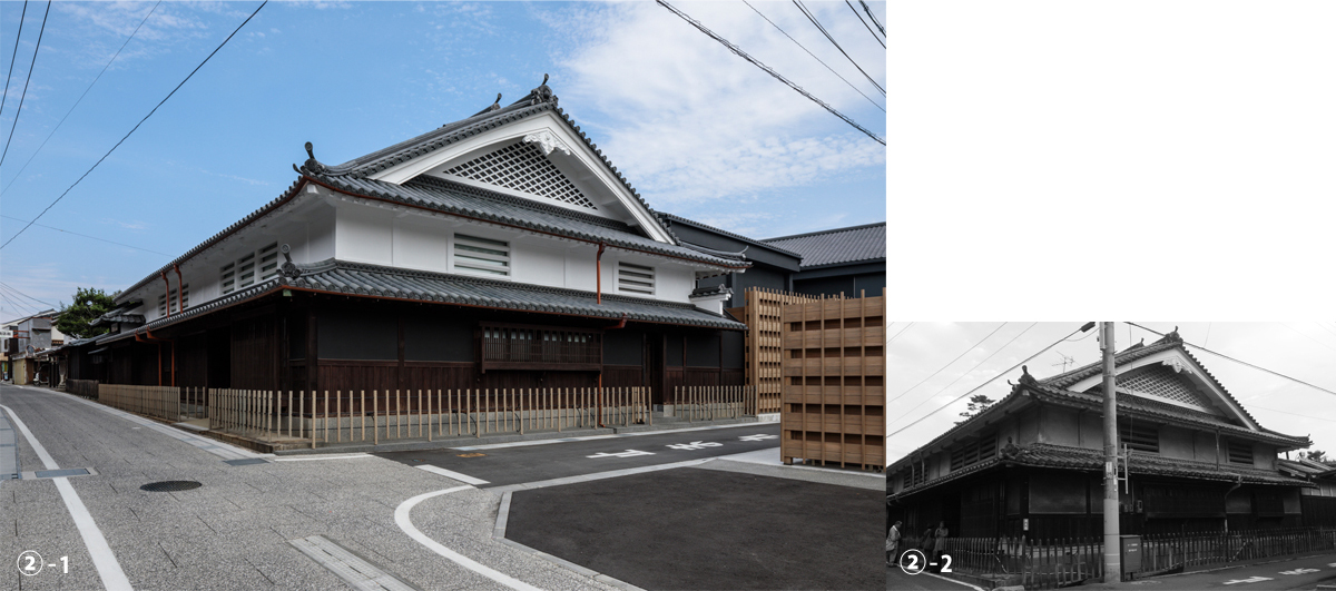 ②-1:After 建物外観 (150年前の姿に修景、電柱移設・道路舗装など行政とも連携) , ②-2:Before 建物外観