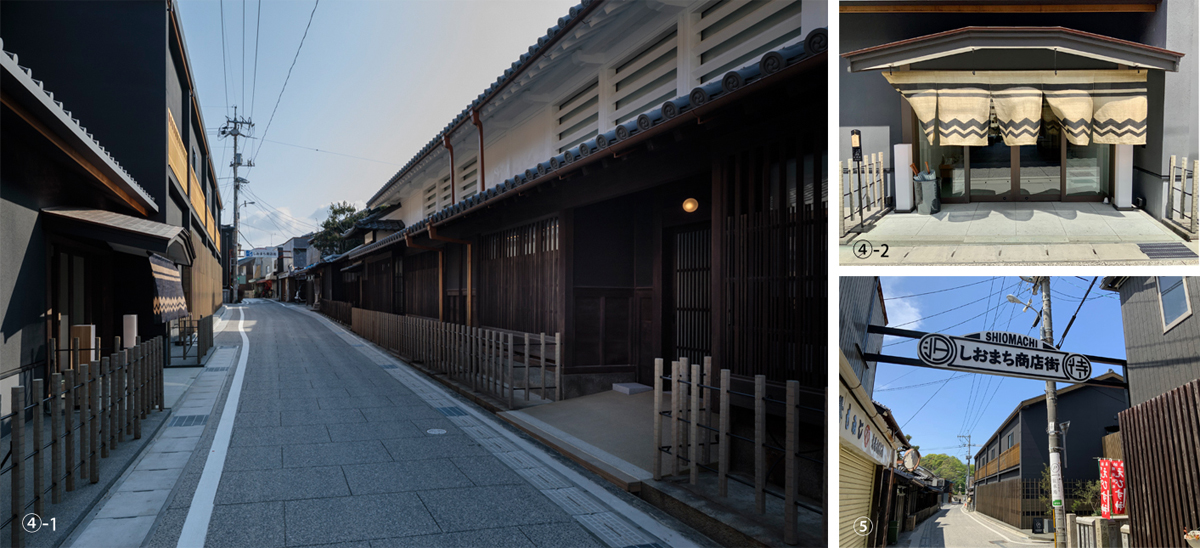 ④-1 左)yubune 宿泊棟・銭湯 右)Azumi 共用棟, ④-2 yubune 暖簾(堀内邸の暖簾意匠を踏襲),⑤ 新設された“しおまち商店街”の看板