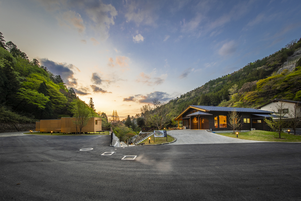 そんな中、熊本地震で被害を受けて、さらにその年の水害でも被害を受けられた温泉施設の再生に携わらせていただきました。温泉旅館だった建物の大部分がひどい被害に遭い、ほとんどの建物を解体せざるを得ない状況の中、大浴場棟のみを残し日帰りの温泉施設として再生されたのが「垂玉温泉 瀧日和」(南阿蘇村)です。飲食&受付棟と家族湯棟を新築し、大浴場棟は改修。再生OPEN日は、発災5年後の熊本地震発災日(2021年4月)でした。