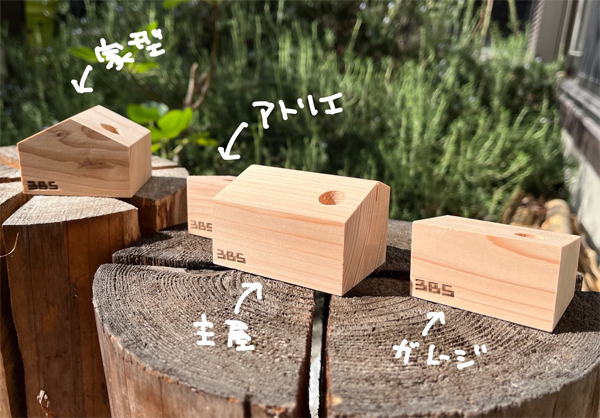 私のこだわりの 1つが、地域の木を使うことです。家に来られた方に、この家で使用した梁の端材でつくった、木のコモノ(カードホルダーやペン立て)をプレゼントしてます。