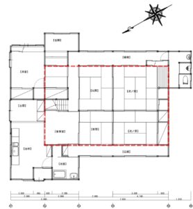 2階建・延床面積は約50坪の木造住宅です。既存は1階に和室4室の田の字プランに加え、北側に台所・浴室などが配置されていました。2階は北側に和室が3室設けられたかたちです。