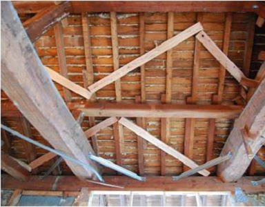 改修内容は、耐震・温熱・バリアフリー対策等、総合的な性能の底上げを行っています。基礎には鉄筋が細かく入っており、補強は行わず、細かいクラック補修に留めています。既存の外壁と柱は残し、傾きの大きな内部の柱を新しいものへと交換しました。小屋梁同士を鋼製火打ちで固めた他、小屋束や垂木面に雲筋交を入れることで水平面の補強としています。屋根は一部の補修としています。