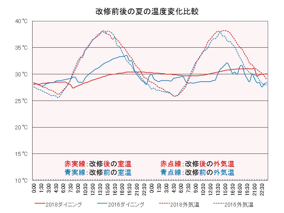 外気温37.5℃の時、改修前は自然室温33℃まで上昇したが、改修後は自然室温30℃程度で抑えられた。※自然室温とは暖冷房を掛けていない状態での室温のこと