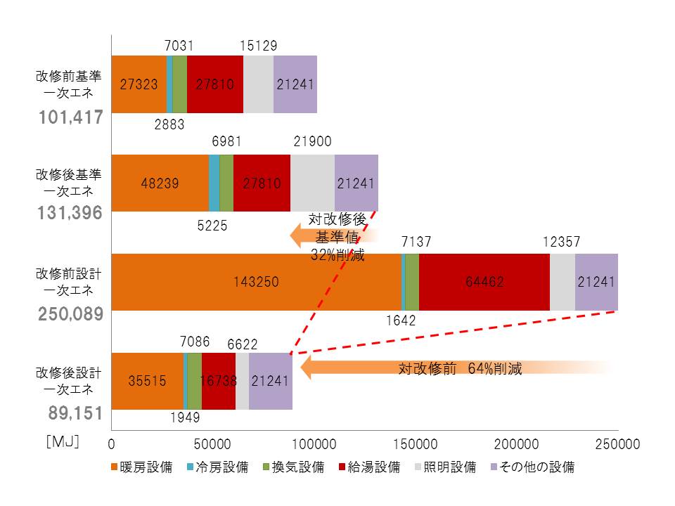 一方、設計値は改修前250GJから改修後89.2GJへと大幅に64%削減される計算結果となった。