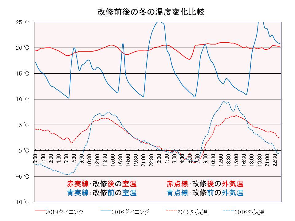 改修前は断熱性能が弱いため、暖房のオンオフを繰り返すごとに室温が激しく変化している。また、体感温度も低いため暖房設定温度が高くなっている。改修後は朝1時間と夕方から就寝までエアコンで暖房しただけで室温は概ね20℃付近で推移し、朝6時の外気温-2℃の時も自然室温は17℃だった。