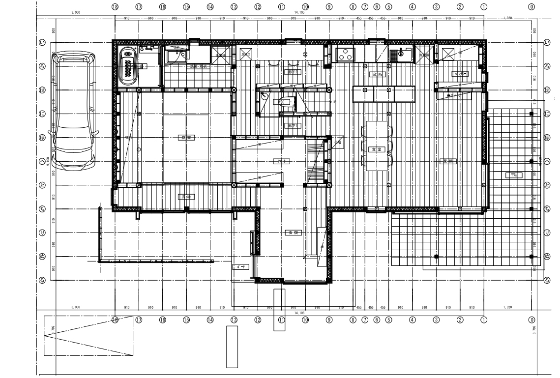 リノベ前の平面はよくある田舎づくり。玄関が内部空間を分断していてとても使いにくい間取りになっていました。そこでリノベ案の計画はまず玄関の問題を処理することから始めました。生活空間(LDK)を一室空間にするためにリノベ前は大きな面積を占めていた玄関のボリュームを増築することで外に出し、新たに設けた土間でつながるクロークで生活空間とプライベート空間との距離を取っています。また玄関を外に出したことにより、道路側(図面左側)から敷地奥への視線に対しての物理的な壁となり生活空間のプライバシーを守っています。これによってこちらも増築をした軒下空間のテラスとともに庭と一体となった開放的な生活を可能としています。この軒下空間は我が家を見学された住まい手たっての希望だったので実現できてよかったです。