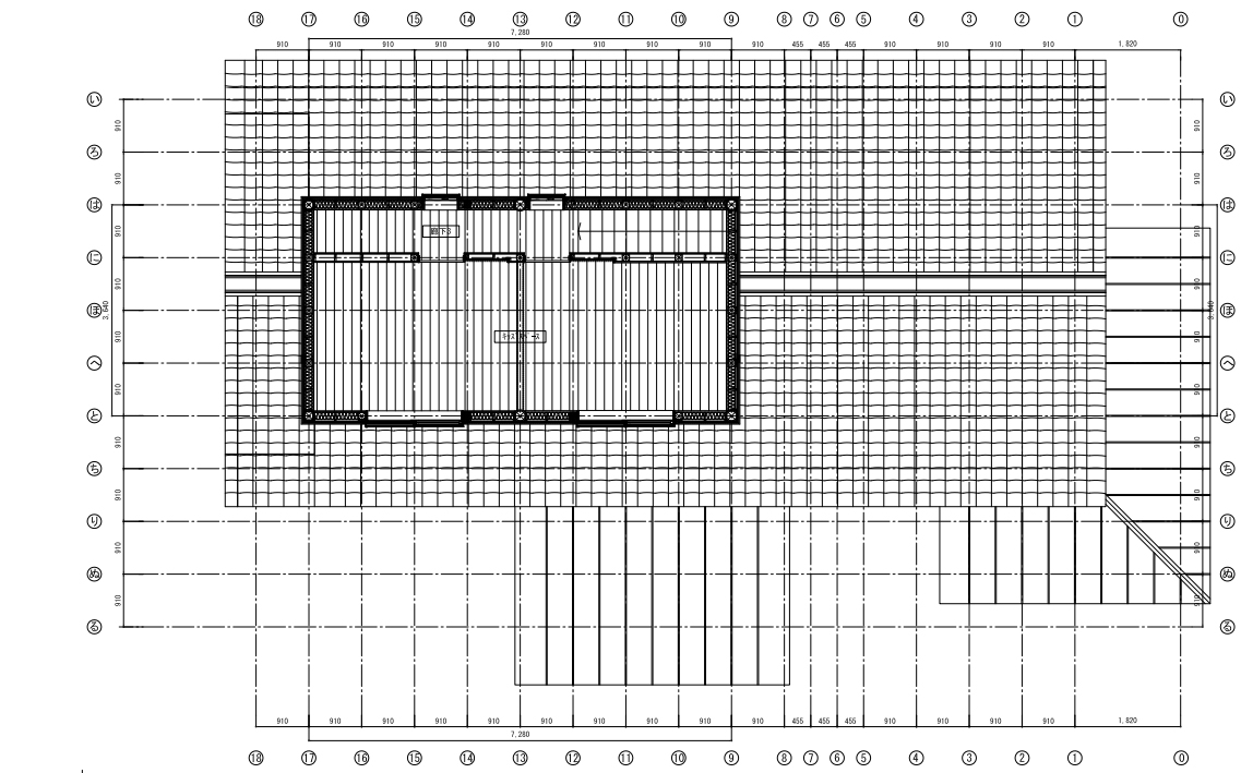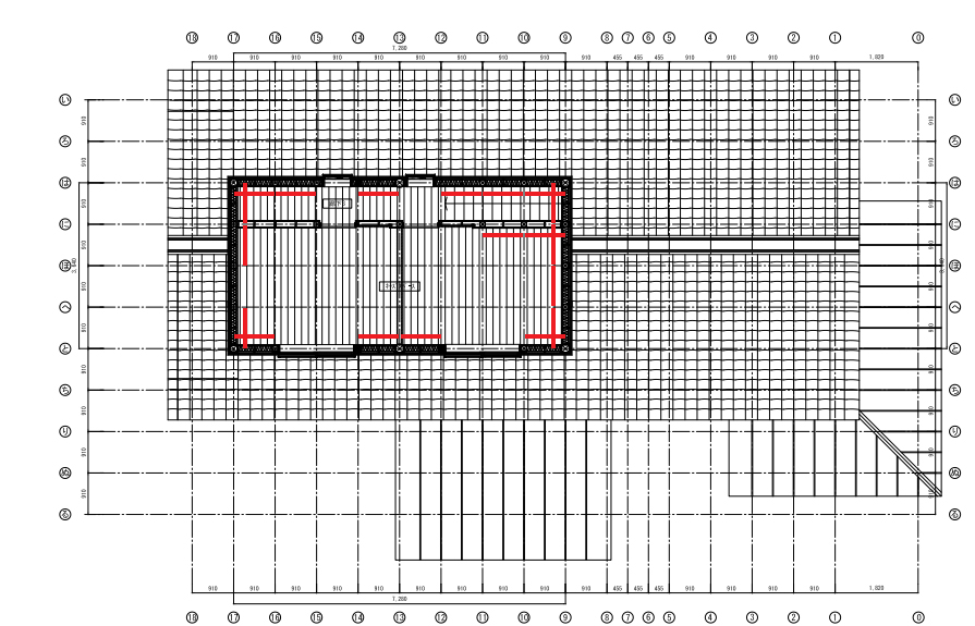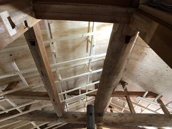 水平構面に関しても面材での構成を基本としています。今回屋根を葺き替えないこととなったため、屋根面の構面は内側より施工することとなりました。下屋部分は下地を組むことが容易だったため面材で対応し、主屋根部分は小屋組等があり、面材の施工が困難だったため鋼製ブレースでの構成としています。