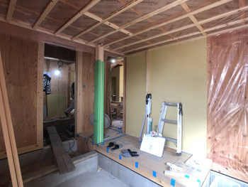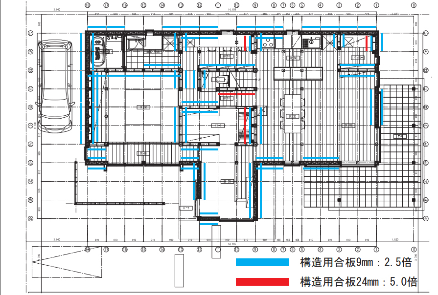 耐力壁の構成に関しては、新築時と同様に面材(構造用合板)での耐力壁を構成しています。