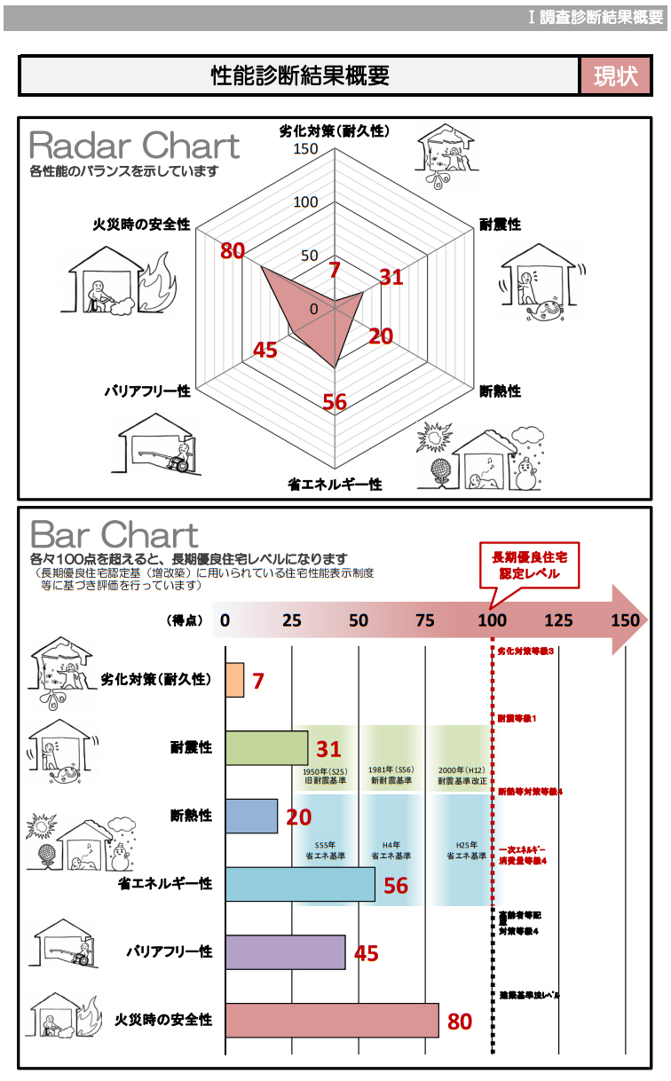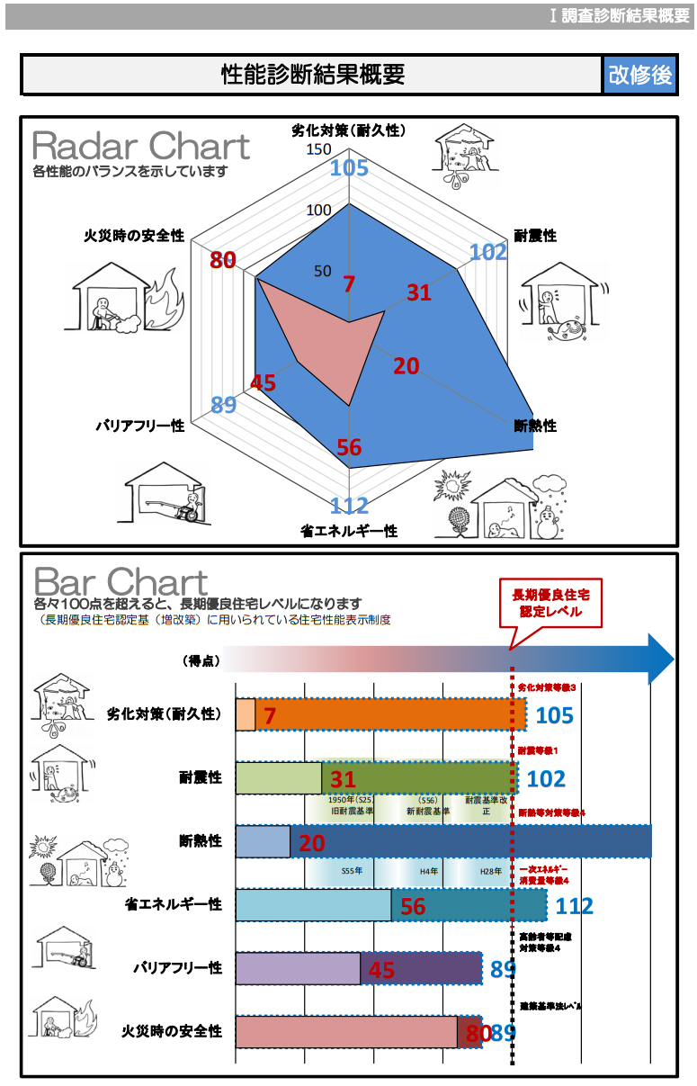 へと大きく改善にしています。「バリアフリー性」と「火災時の安全性」以外は長期優良住宅認定レベルの性能を確保できています。「バリアフリー性に関しては玄関アプローチや廊下巾で減点、「火災時の安全性」に関しては消火器を設置していないので減点・・・といった感じです。