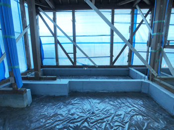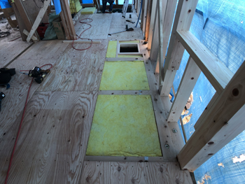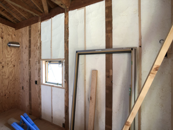 新築と違いリノベの場合は下地の不陸等を含め、すでに色々なものが施工されている状態での断熱処理となります。コストを考えればグラスウールが一番ですが施工時の欠損、気密の確保が新築以上に難しい工事となります。今回施工が比較的容易な屋根、天井、床面は高性能グラスウール16kgを、外壁は発泡ウレタン吹付けで対応しています。またもっとも熱損失の大きい開口部に関しては既存のアルミサッシ+シングルガラスを樹脂複合サッシ+複層LowEガラスへ総入れ替えすることとしました。