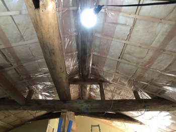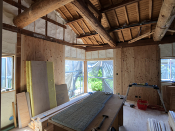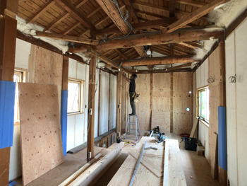 木造に対してのウレタン吹付けは色々と議論があることも承知してますが、リノベーションの場合新築以上に断熱材の充填が難しい部分もあり、性能確保のためには吹付けは大変有利です。セルロースファイバーの充填という選択肢とともにコスト面も含めて検討していきたいところです。