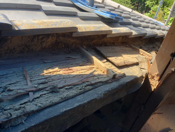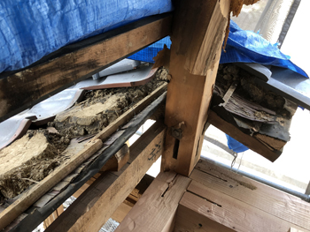 調査時に懸案事項だった下屋屋根が取り付く2階壁の雨染み問題ですが、2階の壁を解体した結果屋根のルーフィングの立ち上げが不十分(ほぼない)状態でした。状況を住まい手に報告し壁際ののし瓦と水上の瓦数枚を剥がし、新たに施工する壁の防水シートを屋根面に被せた後瓦を復旧する処置を了承していただきました。