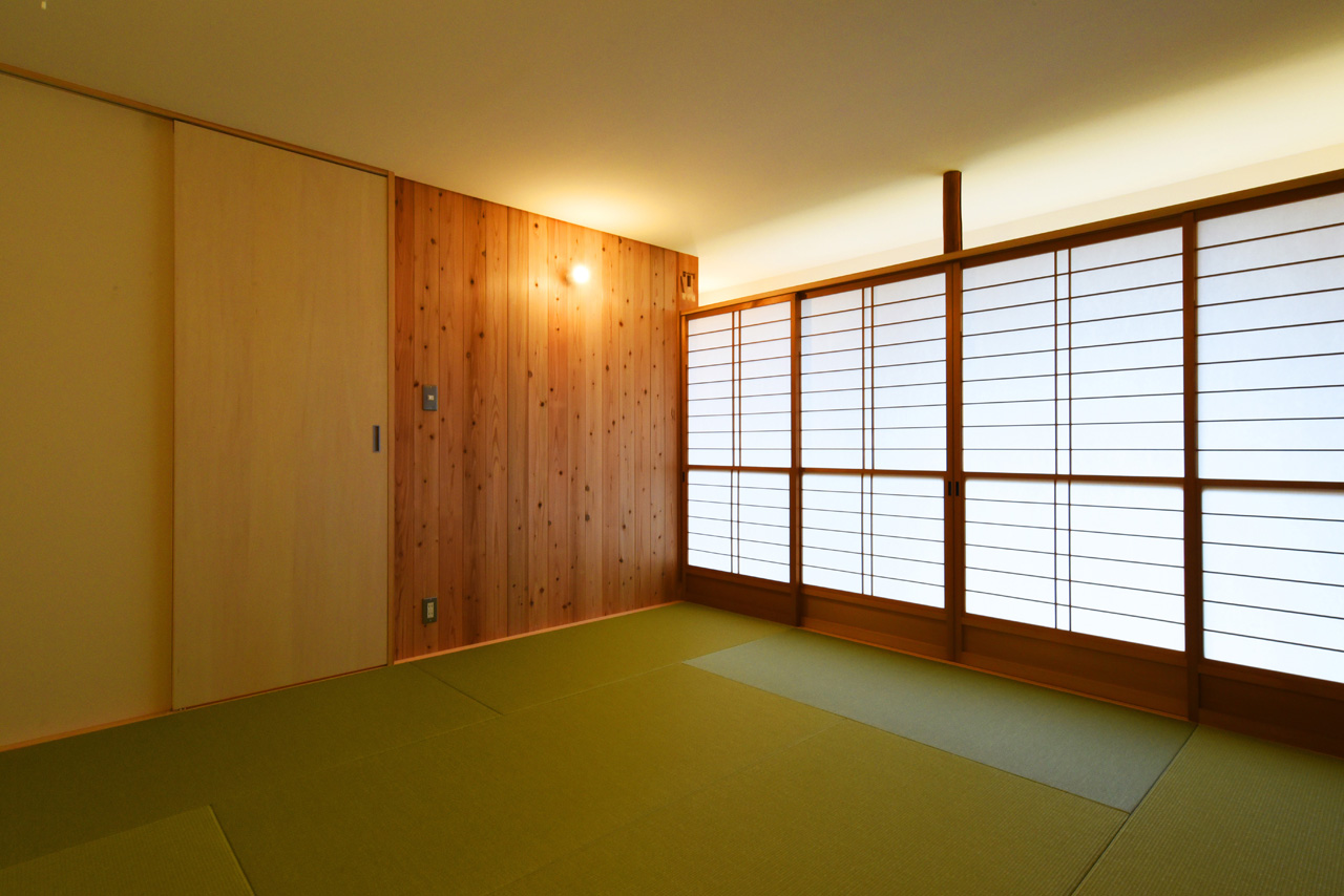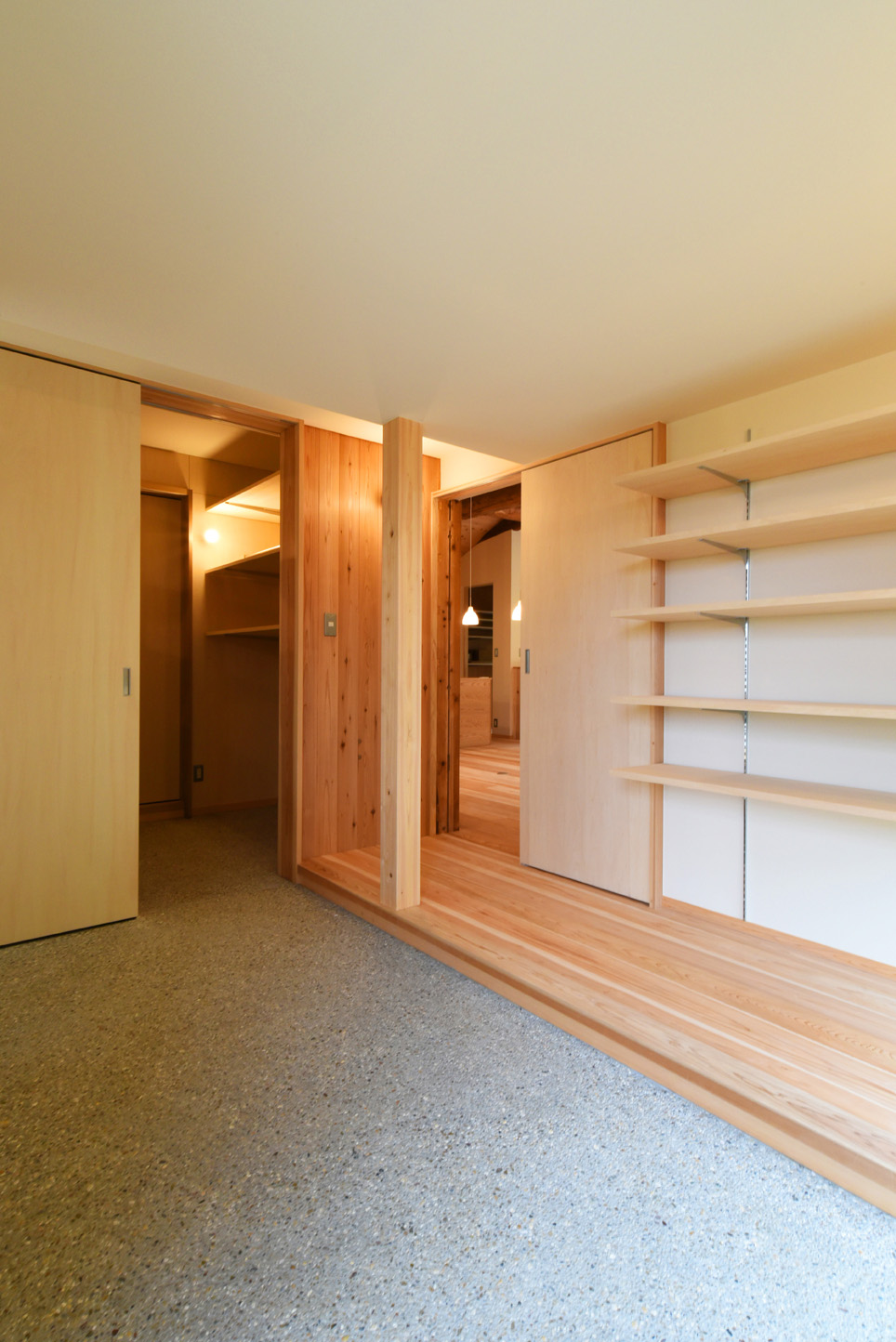 広い土間をもった玄関は住まい手の生活を深い懐で受け入れてくれます。また土間続きとなっている2坪のクロークも収納量一杯。実はこのクロークは住まい手の趣味であるドラム演奏のためのスペースでもありまして、壁と天井には防音処理のためセルロースファイバーが充填されており、建具もグラウウールが充填された建具が2枚ずつ用意されています。