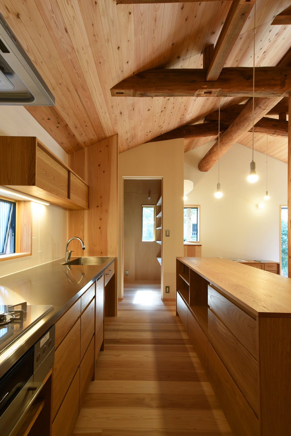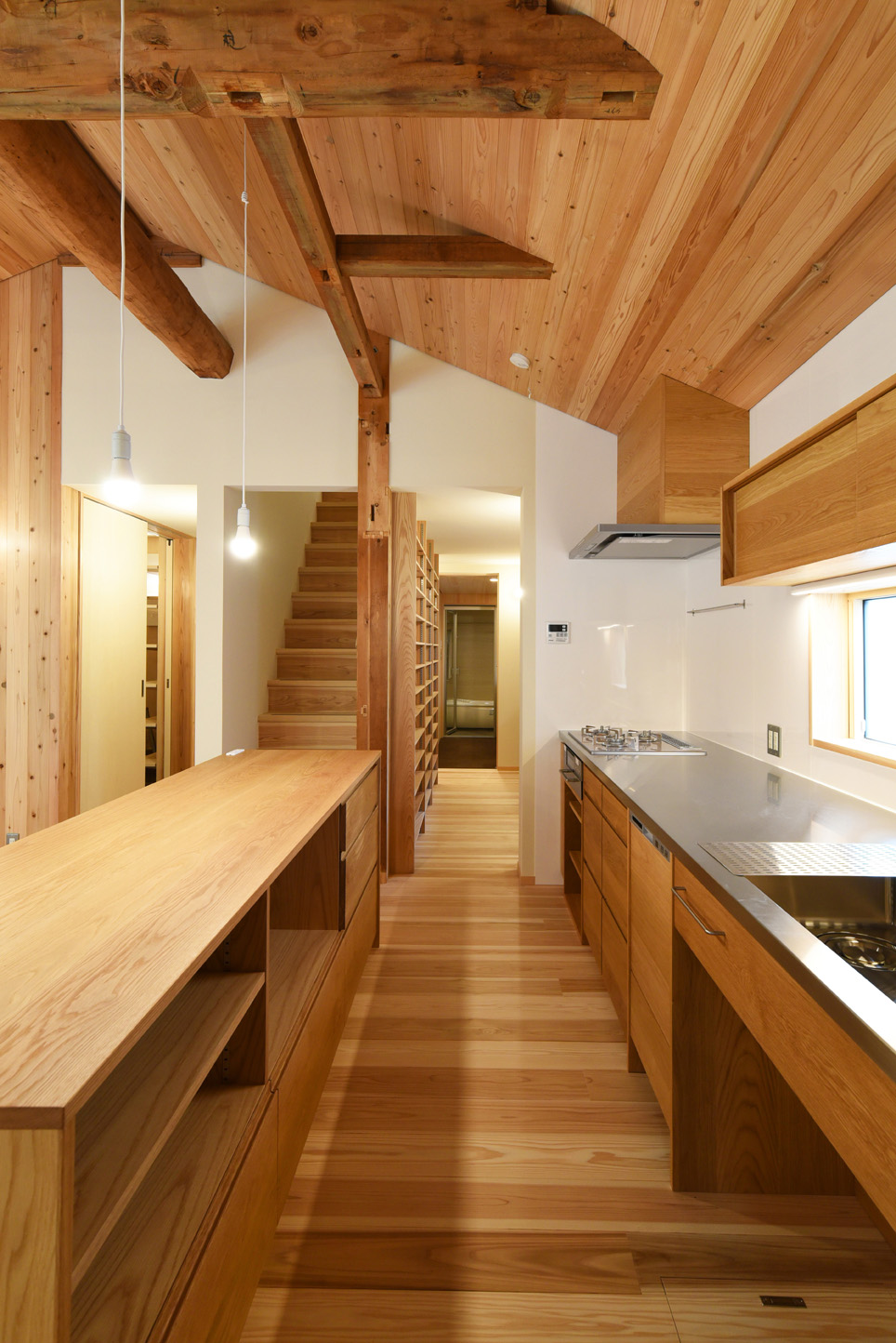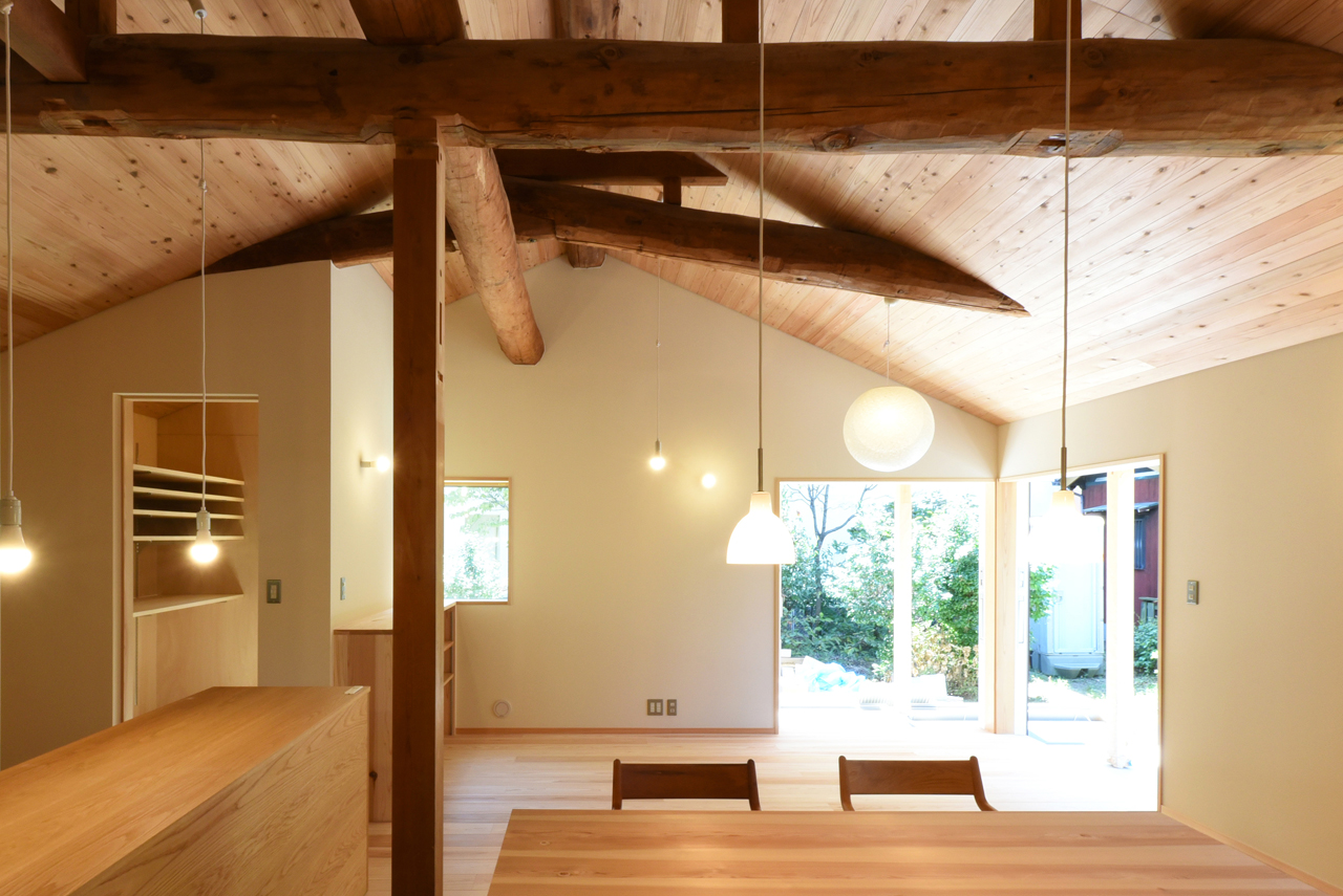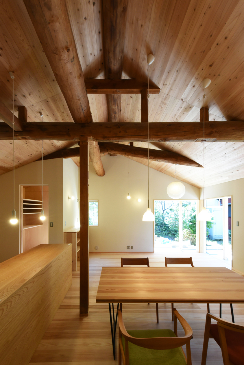 当初の計画ではコストのこともあり、他の空間と同様のフラットな天井の予定でした。解体時に現しになった小屋組をみて住まい手からなんとか現しにできないと相談を受け、現場で小屋組現しに変更した経緯があります。結果空間に変化が出来てよりのびやかな空間になりました。既存の小屋組と杉板の取り合いの納めは大変だったかと思いますが、大工さんが頑張ってくれました。