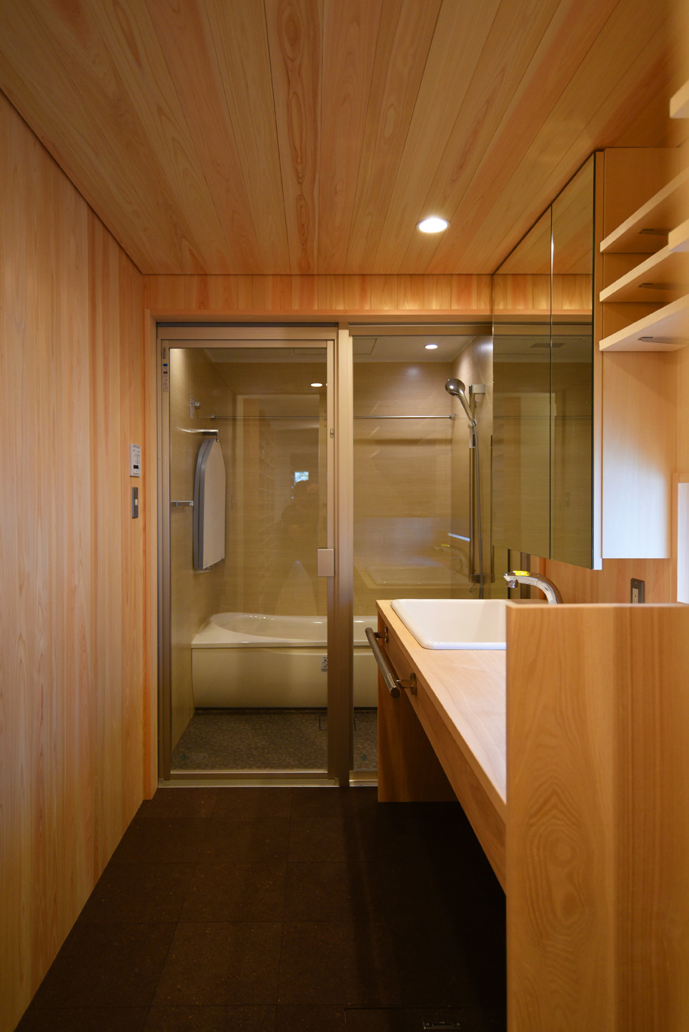 他の空間で使用している造作材はほとんど杉ですが、水廻りだけは無地の桧を使用しています。桧のほんのり薄ピンクの肌が清潔さを求められる水廻りにぴったりです。