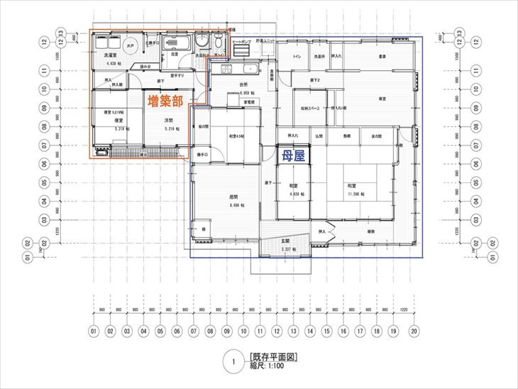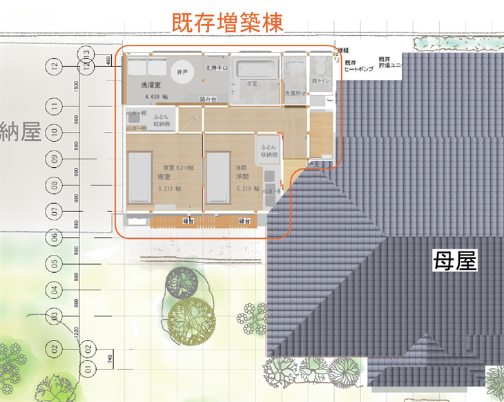 母屋から廊下を通じてつながる既存増築棟。床面積は38㎡。部屋の構成は4.5帖の2間を南側に通路を中央に挟み、北側に脱衣室や浴室やトイレの他、内井戸のある洗濯室を含む平面構成。ここでお客様から示された改修工事の予算は総額で300万円。