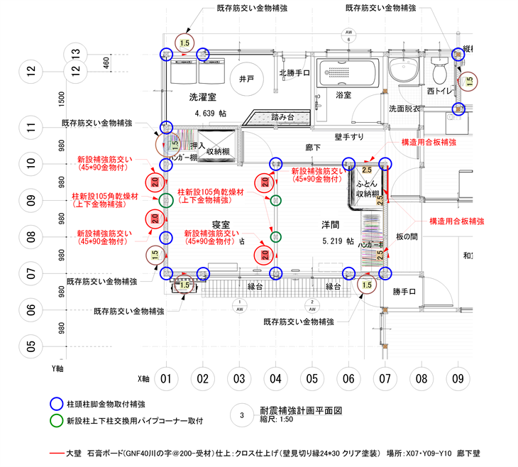 新設筋交い、合板壁補強及び、軸組と梁構面をそれぞれの金物を用い補強を施しました。
