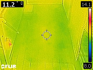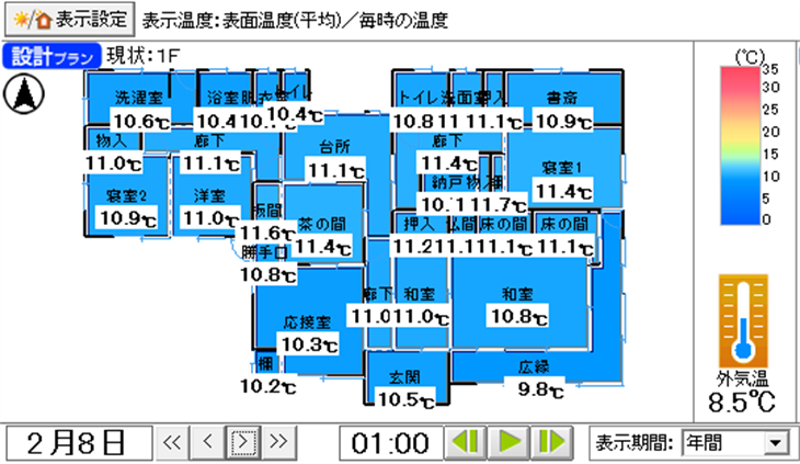 計測したのは2月5日曇りの日の朝。外気温はこの時8.4℃。部屋にはエアコンは設置されてはいましたが、調査時はエアコンはOFFで計測を進めたため、足元から冷たさと共に身震いをする寒さを感じながら計測。サーモカメラで室内表面温度を計測すると平均して11℃。既存の仕様で診断ソフトにて室温度をシュミレーションしてみると同様に室内温度は概ね11℃前後に。