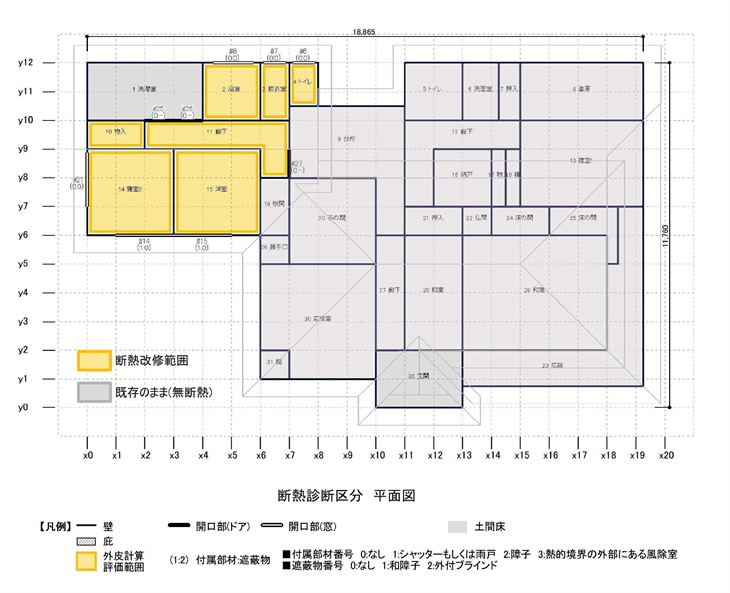 これから断熱改修を行う部分(黄色)とその他(灰色)と区分を付け、温熱シュミレーションソフトにてそれぞれの現況の評価を行いました。