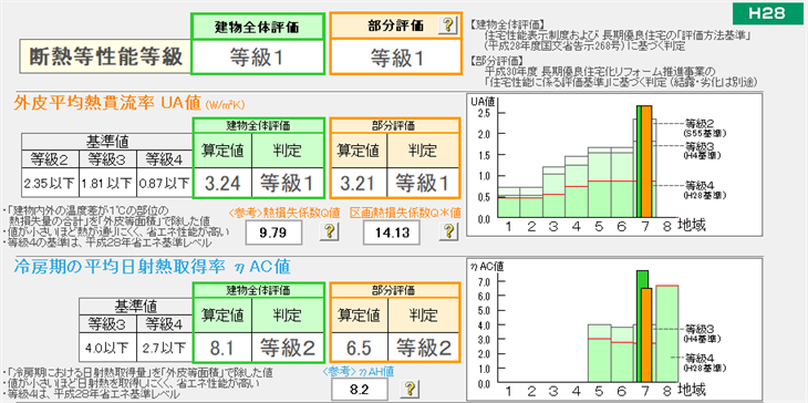 改修計画仕様での評価等級。改修以外を含む建物全体の外皮等級は現況と変わらず等級1のまま。