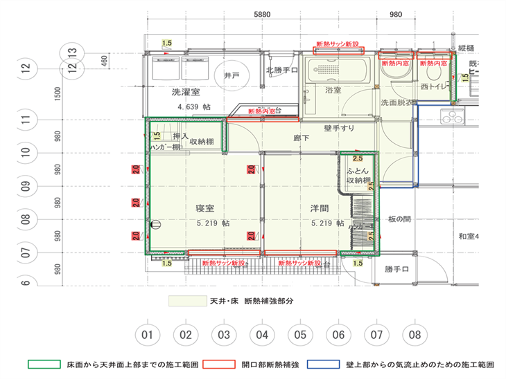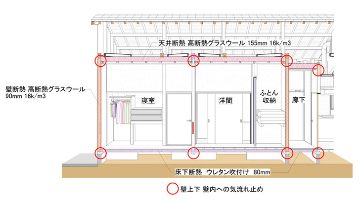 平面での断熱計画は色付された部屋部分のみとし、それ以外は既存のまま。断面計画では床には発泡ウレタン吹付けの断熱、壁天井にはグラスウール断熱とし壁上下には気流止めを施す計画としました(浴室は窓のみ断熱サッシに取り替え)