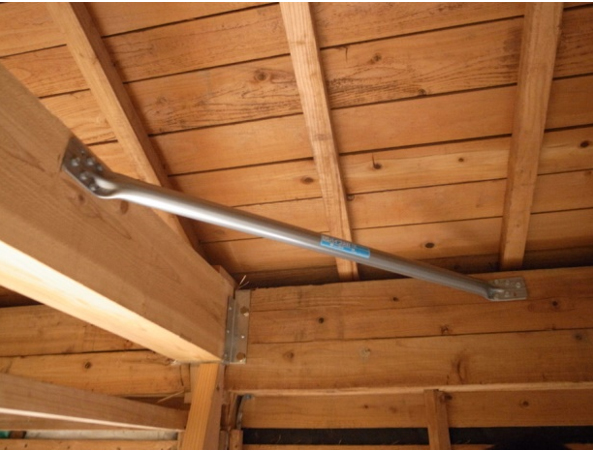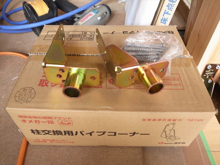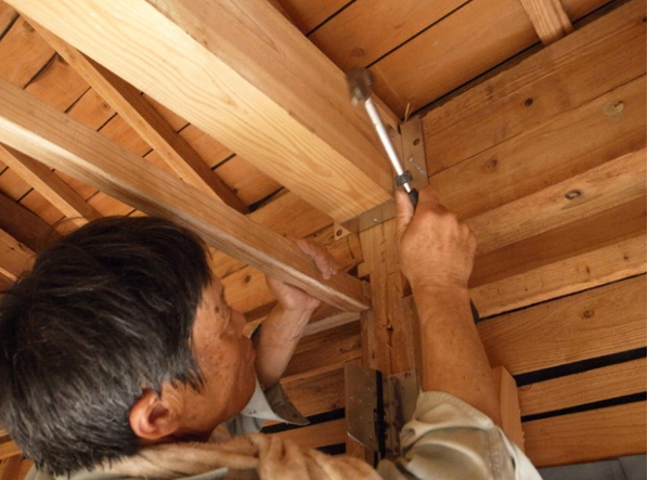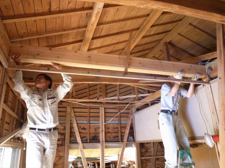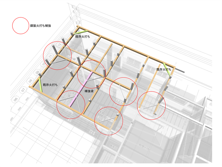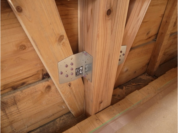 新設筋交い、合板壁補強及び、軸組と梁構面をそれぞれの金物を用い補強を施しました。