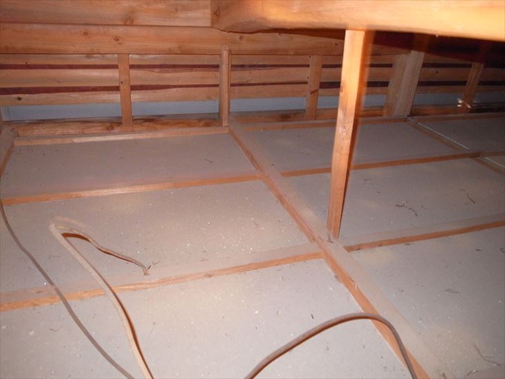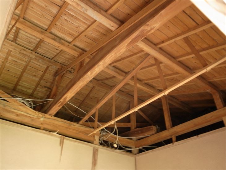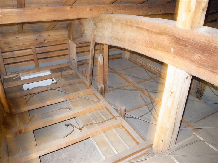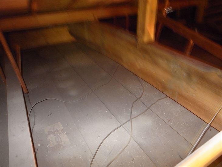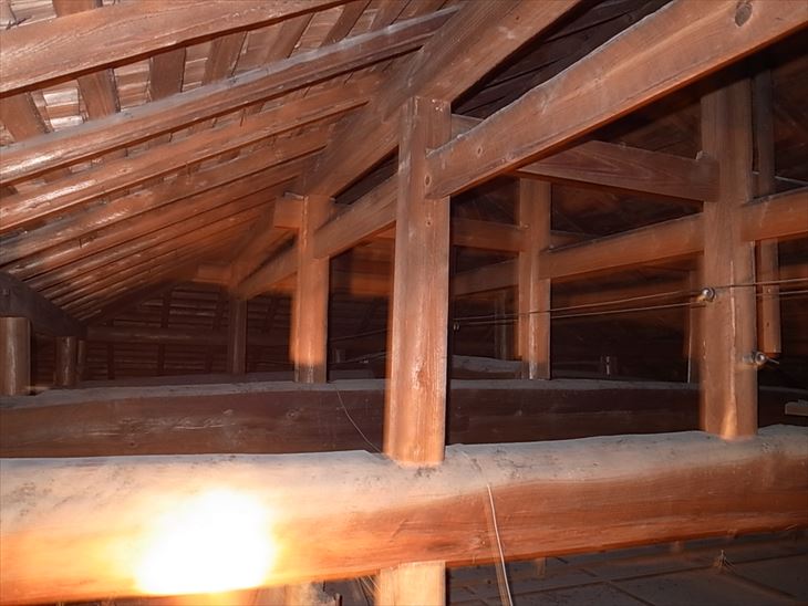 小屋裏現況。雨漏りや小屋組みそのものの劣化は見受けられず、構造面では健全な状況。