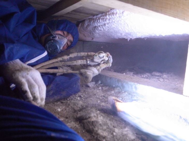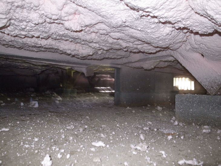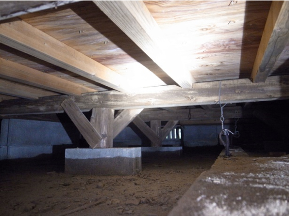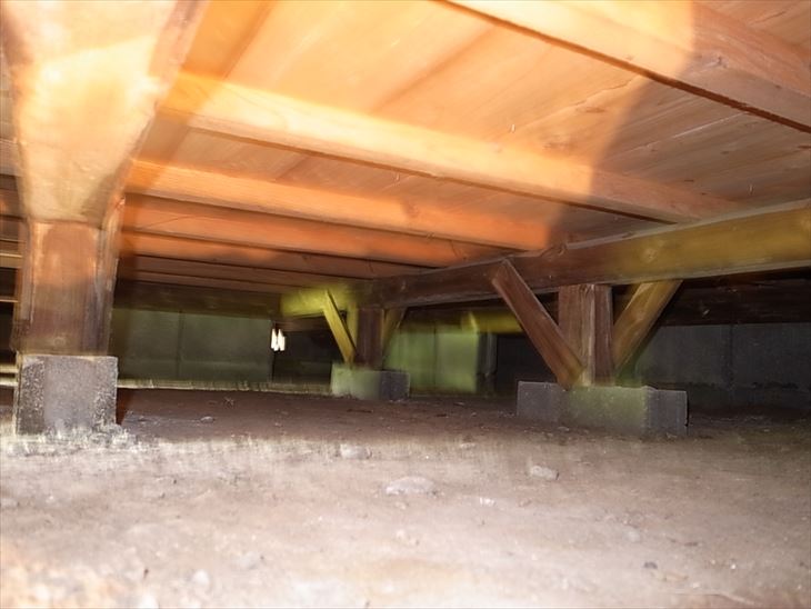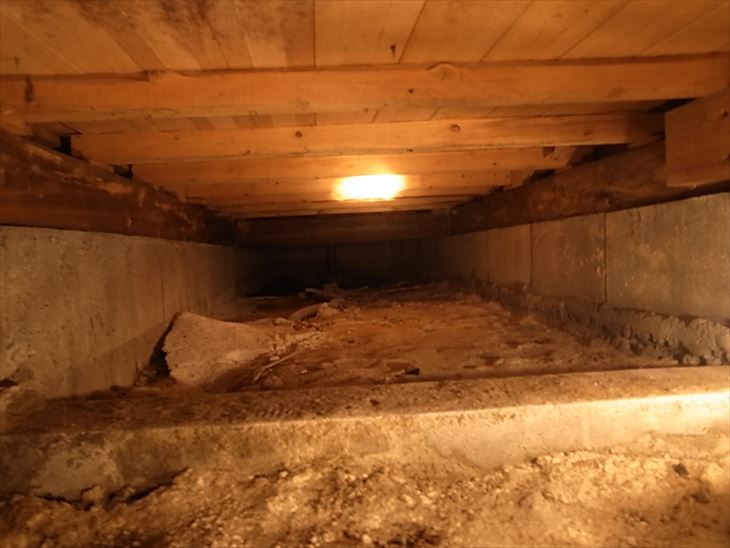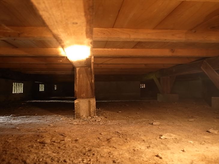 床下現況。増築部は母屋と変わり布基礎の造り。ただし部屋下はスラブはなく土壌が現れとなった現況。また、天井面同様、床下面も断熱は施されていない現況でした。