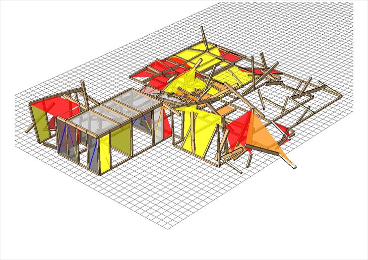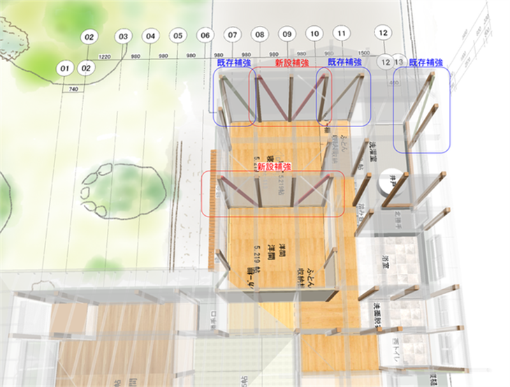 構造計画については洋間にふとん収納スペースを新たに設ける他は間取りの変更は行わず、既存壁の補強を中心に金物補強及び柱脚柱頭金物の設置を計画しました。ただし、部分改修のため数値向上については1.0を満たすことは出来ず、現状から出来る範囲での補強という範囲に留まる提案としました。その上で、シュミレーションソフトで補強モデルを作成し、耐震効果の具合を動画で確認しました。シュミレーションは既存部分は現況のままで増築部分のみ補強計画を入力。