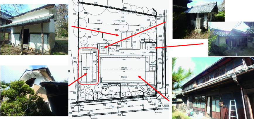敷地は広く、中央に母屋、蔵①②、浴室、便所がある。今回は西側の蔵① の利活用が決まり、改修と耐震補強を行う為の調査を行う。