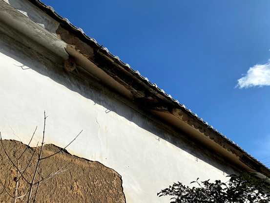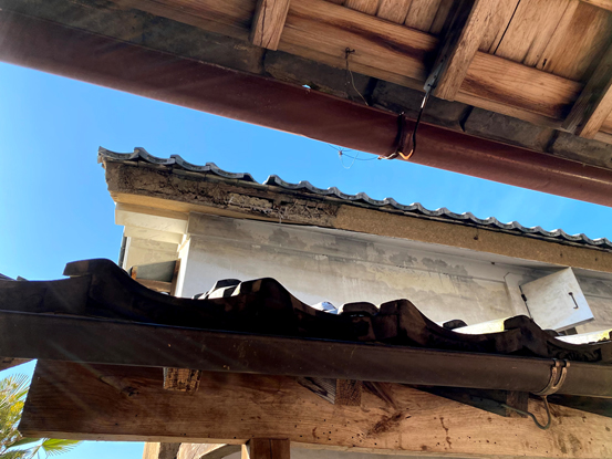 ![]() 雨漏れによる軒先漆喰の劣化 |