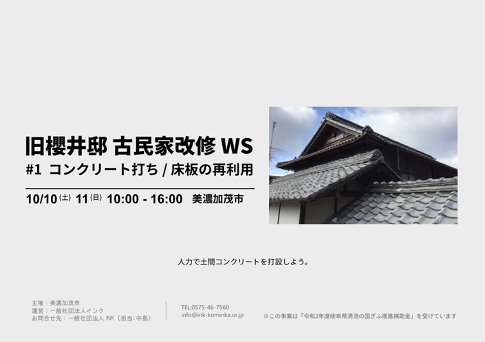 母屋は今後に改修する。建物に興味を持ってもらう為に「♯1 コンクリート打ち/床板の再利用」ワークショップを開催した。