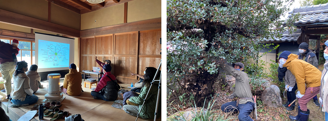 庭師と一般の方で行った「庭づくりワークショップ」では、広大な敷地の庭がきれいになった。参加者は、庭師から庭木の手入れなどレクチャーをうける。