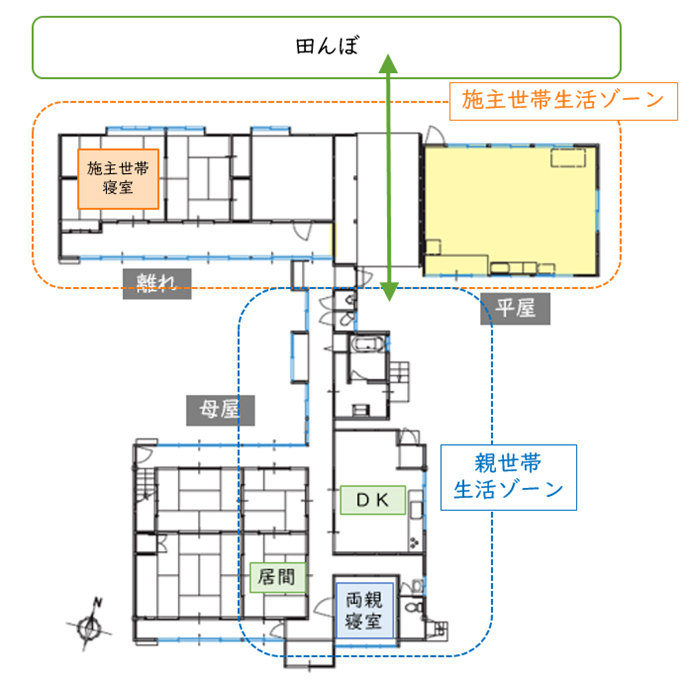 平屋棟と、元々寝室として使われていた離れ棟を施主世帯の生活ゾーンに、母屋棟を親世帯の生活ゾーンとし、お互いに気兼ねなく暮らしていただけるようにしました。