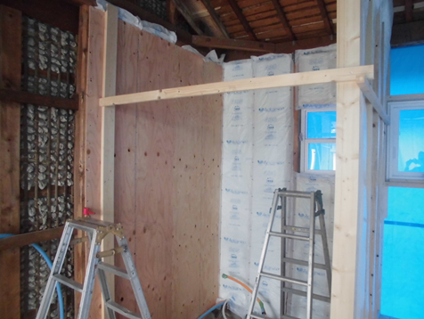 耐震施工の様子(壁補強は構造用合板、ステンブレースを使用)