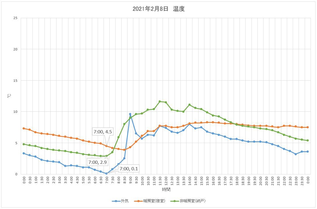 測定期間中で外気が最低温度になった 1日で見てみると、工事後は非暖房室で10℃を下回る時間帯があるものの、温度変化は一日の中で一定していました。断熱等級4の仕様がどのような温湿度変化になるかが分かりました。