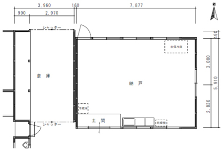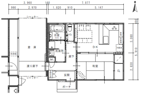 打合せの初期段階では平屋棟の東側を減築して倉庫兼農機具通路を確保するプランも検討しましたが、施主のご要望で最終プランでは、倉庫は既存の位置のままとすることになりました。