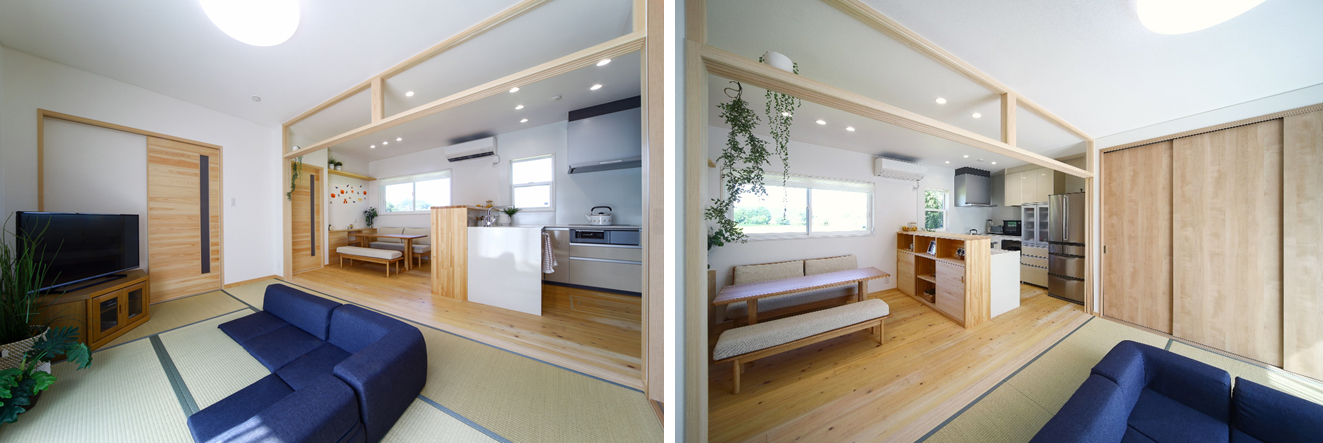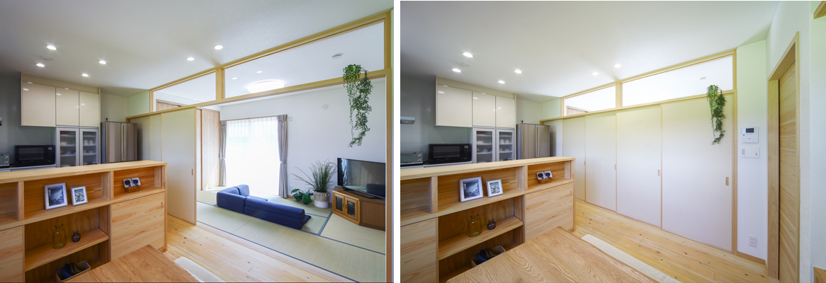 After  間仕切り襖の上部をランマ(FIX窓)とすることで、襖を閉めても天井がつながり、かつ南面の採光がDKまで届く。