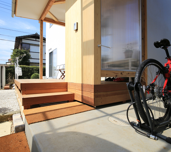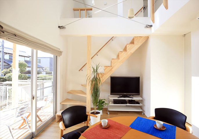 階段の向きを変更、2階は減築でも良いとのご要望であったが予算上、吹抜けを提案し南側にデッキと庇を作り、デッキより出入りする。