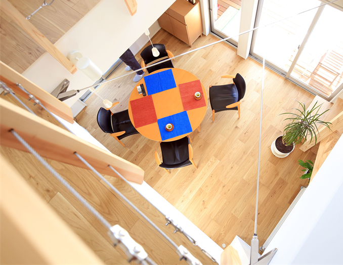 2F吹抜け部に窓を設けることで、LDKの奥まで陽が⼊るようにしている。