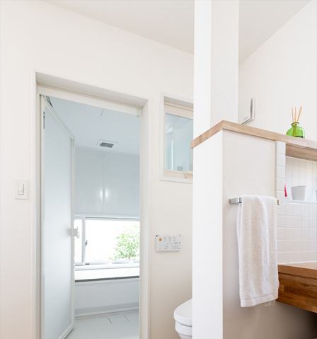 洗面・脱衣・トイレを一室として居間と寝室を繋げないプランなっています。優先順位一番であった耐震については、上部構造評点1.0以上を確保するとともに、保険として制震装置を入れています。