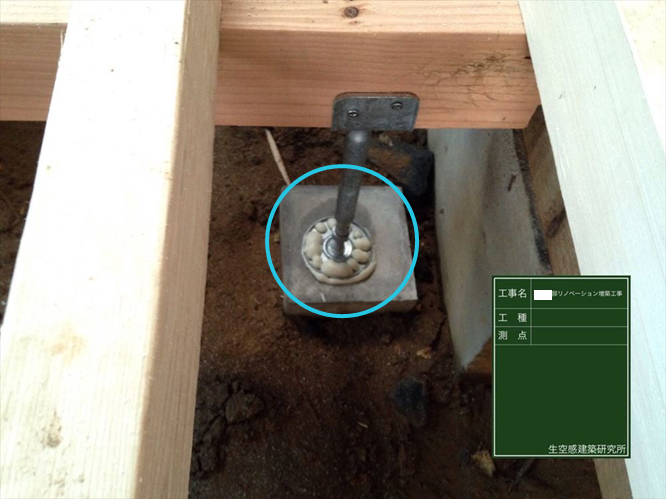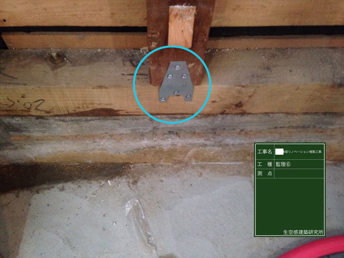 内部床・壁・天井スケルトン改修としていることから、柱脚⾦物はN値計算により全ての柱に⾦物補強を⾏っている。